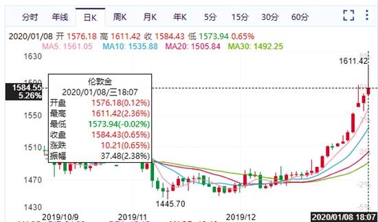 现货黄金在去年全年上涨18%,成为自2010年以来表现最好的一年。而对于2020年黄金的表现,众多国内外专业机构都坚定看好。从今年开盘的5个交易日来看,连续飘红,从1516美元/盎司左右一路涨至昨日高点1611.42美元/盎司。