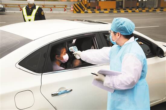 ■在广州机场高速三元里收费站出口,工作人员对乘客进行体温测量。 新快报记者 毕志毅/摄