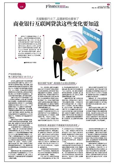 ■新快报记者 许莉芸[疫情之下无接触银行服务火了,与此同时,互联网贷款新规也即将面世。据新快报记者了解,今年1月下旬,部分商业银行就收到了监管下发的《商业银行互联网贷款管理暂行办法》(简称《暂行办法》)。据业内人士表示,这是监管对于互联网贷款监管办法的第二稿,与2018年的第一版本相比有“松”有“紧”,其中给联合贷款“松绑”,取消了各方出资上限限制等;对于线上个人贷款授信则规定了最高30万元的限额,并且严控贷款用途。]