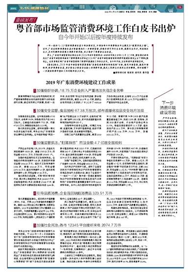 那么,广东省市场监管局在刚过去的2019年有何监管亮点?未来有何努力方向?3月12日晚,新快报记者率先从广东省市场监管局拿到了新鲜重磅出炉的《2019年广东省市场监督管理局消费环境建设报告》(以下简称《报告》)。这是首部反映广东省市场监管部门消费环境建设工作的白皮书。自今年开始,以后将按年度持续发布。