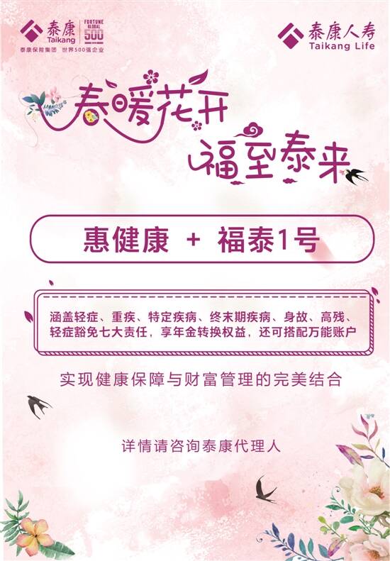 泰康人寿“惠健康”搭配“福泰壹号”组合形成“惠福泰”计划的震撼上市,体现了泰康大健康+强资管的强强结合。