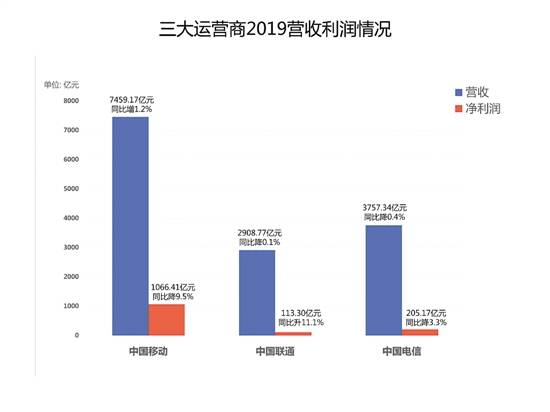 随着昨日中国电信公布去年全年业绩,至此,国内三大基础运营商2019年的年度业绩报告悉数出炉。根据财报综合来看,2019年三大运营商共营收14125.28亿元,净利润1384.88亿元,平均日赚约3.79亿元。其中,中国移动赚得最多,2019年净利润为1066.41亿元,但同比下降了9.5%;中国联通净利润达113.30亿元,增长最快,增幅达11.1%,但营收2908.77亿元,同比轻微下降0.1%;中国电信则营收利润双降,营收3757.34亿元,同比下降0.4%,净利润205.17亿元,同比下降3.3%。■新快报记者 郑志辉