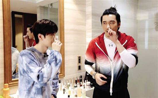 新快报讯 记者梁燕芬报道 电视剧《有匪》自开拍以来便话题多多,其中胡兵饰演女主赵丽颖的外公,被网友称为“史上最帅外公”。近日,胡兵受邀参加综艺节目《天天向上》,与节目当家主持同时也是《有匪》男主王一博有趣互动。由于疫情的原因,节目仍以云录制的方式进行。节目中,胡兵展示自己在剧组的“家”——零食一大堆堆满了浴缸,琳琅满目的化妆品摆放得错落有致,让王一博大开眼界。现场,胡兵给王一博传授护肤成分的理论,专业理论让王一博完全是惊呆状态。此外作为大哥,胡兵还传授小弟一些新奇东西,比如大学里玩过的拔鼻毛神器。王一博被胡兵“引诱”,带着体验拔鼻毛,上演大型“真香”现场。做饭环节,因为没有提前解冻牛肉,两人唯有手工解冻。胡兵还化身美食博主,用空气炸锅现场炮制王一博最爱吃的炸鸡。