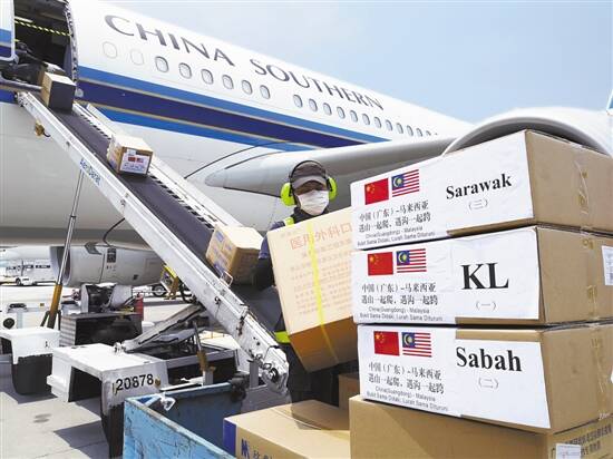 ■18日,在吉隆坡国际机场,地勤人员搬运中国抗疫医疗专家组带来的物资。新华社发