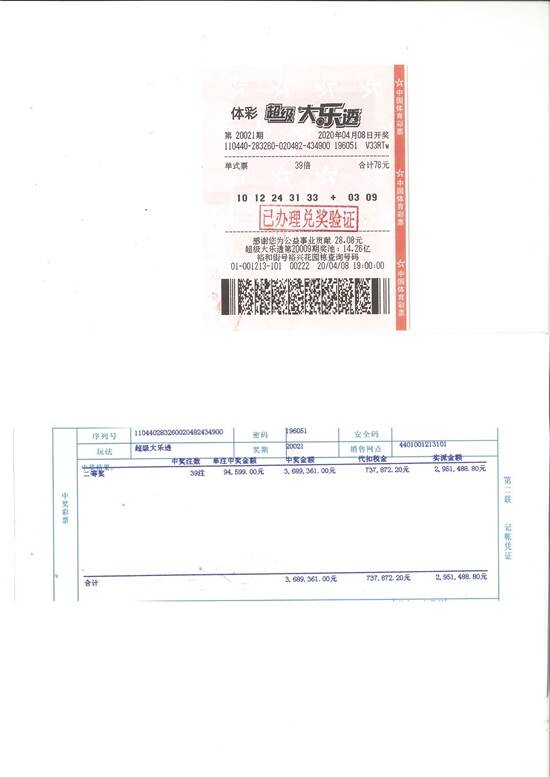 【4月8日,体彩大乐透第20021期开奖中,来自广州南沙的幸运儿小关(化名)当期以倍投中出39注二等奖,奖金共计368万多元,因一个后区号码之差错失至少2亿元巨奖。■新快报记者 陆妍思 通讯员 李琪】