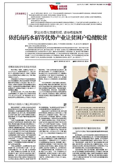 “扶贫,产业是最关键的。”彭仲典介绍说,罗定优质农产品和药材较多,拥有罗定稻米、罗定肉桂、罗定皱纱鱼腐、罗定豆豉、泗纶蒸笼这五个“国家地理标志保护产品”,因此,把产业扶贫作为最有效、最稳健的脱贫途径。罗定重点依托其作为广东现代特色南药试验区核心区的区位优势,以及云浮南药(罗定肉桂)产业园、罗定丝苗米产业园这两大省级现代农业产业园的载体优势,全域推进南药、水稻产业扶贫。“我们这里肉桂种了42万亩,品相非常好。还有贫困户种植紫苏,当年种当年收,十几亩药田一年能有几万块的收入,当年就能见效益。”此外还有广藿香、板蓝根等药材,今年疫情期间中药原材料需求增大,扶贫产业的收益有保障。