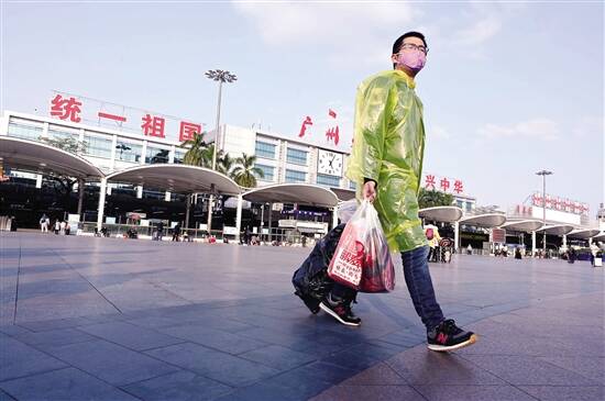 ■一位提着行李者大步走过广州火车站广场。新快报记者 夏世焱/摄(资料照片,图文无关)