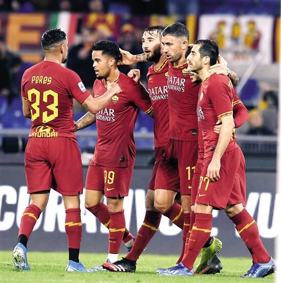 ■2月23日,罗马队球员在比赛中庆祝进球。 新华社发