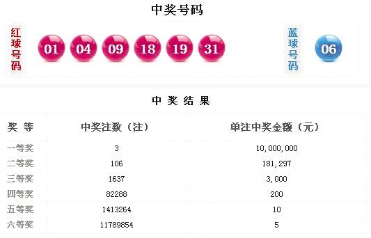 新快报讯 记者陆妍思报道 4月19日,双色球进行第20026期开奖。全国仅中出3注1000万元头奖,开奖后奖池上涨至7.69亿多元。第20026期双色球的中奖号码为:红球“01、04、09、18、19、31”;蓝球“06”。红球大小比3:3,三区比3:2:1,奇偶比4:2,其中“01”“09”为上期重号,“31”为隔期跳码,开出一组二连号“18、19”,同时开出两组同尾号“01、31”和“09、19”;蓝球则开出遗漏39期的“06”。