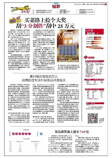 同期二等奖中出106注,单注奖金18万多元。当期末等奖开出1178万多注。 当期全国销量为3.49亿多元,其中广东继续以4351万多元高居全国销售榜首。计奖后,双色球奖池金额为7.69亿多元,下期彩民2元单倍投注最高可中得1000万元。