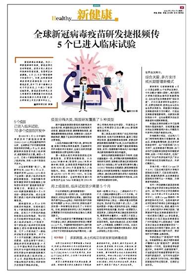 从全球范围看“前三”。据新华社电,2020年3月16日,美国研发的mRNA-1273成为了全球第一款进入临床试验的新冠病毒疫苗,中国军事科学院军事医学研究院陈薇院士领衔团队研发的“重组新冠疫苗”紧随之后,美国名为INO-4800的新冠病毒疫苗4月6日启动一期临床试验,成为全球第三款进入临床试验的新冠病毒疫苗。