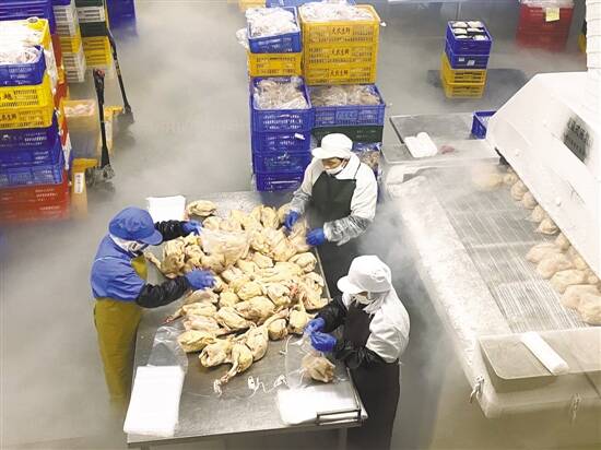 ■天农食品公司生鲜宰杀车间,忙碌的工人正在锁鲜包装。新快报记者龚吉林/摄