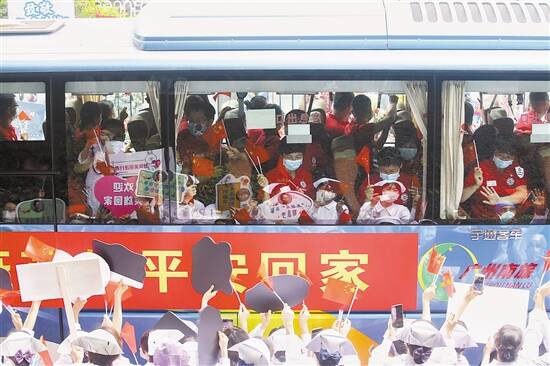 新快报讯 记者黎秋玲 毕志毅 通讯员彭福祥 梁嘉韵报道 昨日下午,中山大学附属第一医院第三批驰援武汉医疗总队131名医护人员结束14天休整返院、回家,中山一院举办全体援鄂医疗队员归队欢迎仪式。现场有100多位医疗队员的家属参加了欢迎仪式,经历两个多月的分别终于与亲人团聚,场面令人感动。