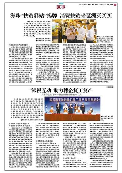 2020年是脱贫攻坚收官之年,海珠区肩负着五省十一个县(市、区)90个贫困村的精准扶贫和结对帮扶任务。为加大消费扶贫力度,助力打赢脱贫攻坚战,海珠区扶贫办不仅设立了消费扶贫专班,还在中洲农会设立“广州市海珠区扶贫驿站”和“海珠区对口帮扶地区农特产品专区”。为讲好海珠脱贫攻坚故事,区扶贫办还携手广东新快报社,推动“广东新快报社扶贫工作站”落户海珠区。