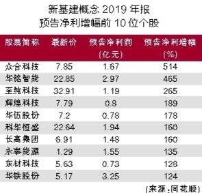 从财务数据来看,记者经统计,“新基建”板块概念股有73只,其中已预告2019年年报的公司,净利润增幅超100%的公司有21家,占比近三成。众合科技以预告净利润增514%夺冠,公司表示,利润大增得益于城轨信号系统在手订单的增加,智慧交通业务板块的营业收入与毛利额有较好提升,但今年一季报业绩预亏。第二、三名分别是华铭智能和至纯科技,预告年报净利润增幅分别为465%和265%。