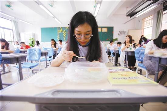 ■省教育厅副厅长王创建议学生自带餐具,打餐以后回宿舍、教室用餐。图为4月20日执信中学举行的复课演练。 新快报记者 郗慧晶/摄