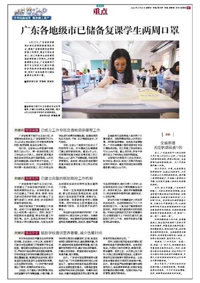 他介绍,全省有4853所普通中学教职员工近50万人,第一批返校的高三初三学生共187万多人。返校前,要求重点地区返校的师生进行居家隔离,14天后进行核酸检测,没有异常方可返校。广州市在返校前7日内,对全体教职员工和对第一批返校的高三、初三年级全体学生进行免费的核酸检测。检测结果阴性且无发热、干咳、乏力等疑似症状,方可返校。