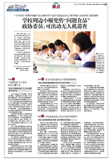 辣条、炸鸡、奶茶……这些学生至爱的零食是否卫生?广州初三、高三学生返校,在学校食堂用餐能否吃得放心、舒心?近日,广州市政协“有事好商量”民生实事协商平台就“校园食品安全”展开调研,并向相关政府部门建言献策,希望守护学生们“舌尖上的安全”。针对非中心城区部分学校周边有流动摊贩向学生兜售“问题食品”一事,有政协委员建议:可使用无人机进行巡查,提高城管执法“巡查+守点”方式的灵活性和可靠性。