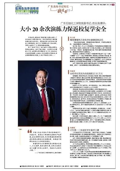 开学在即,高校如何“迎接”数万名师生返校?广东石油化工学院党委书记、校长张清华近日接受新快报记者专访时表示,学校经过两个多月的全力防疫,目前零疫情。而且,为了保障师生员工安全返校,学校已经进行了20多场校园防疫演练。除了“备战”开学,广东石油化工学院全体师生和校友此前也一直忙于助力战疫:九旬党员夫妇捐款4万元,全校师生党员捐款近30万元;留在武汉无法返校的教授,主动加入社区志愿队支持战疫;校友纷纷捐款助力战疫,10多万件物资已到位……