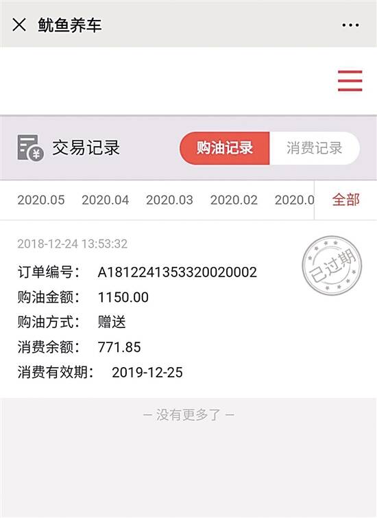 新快报记者在黎女士提供的购油记录中看到,黎女士有771.85元的余额,消费有效期为2019年12月25日,并标注着已过期。“我4月20号左右看到余额还有700多元,现在突然有了有效期,把我的钱‘吞了’。”她表示,此前该公众号并无提醒用户金额有使用有效期,“五一”后才发现公众号多了使用规则须知,这才告知用户有使用期限。