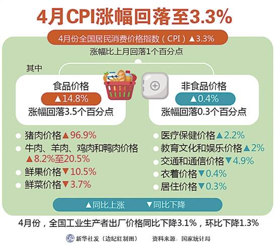 国家统计局昨日发布数据,在经历了连续三个月的同比涨幅收窄后,4月全国居民消费价格指数(CPI)同比涨幅回落至3.3%,重回“3时代”,食品价格和柴汽油价格环比均明显下降。4月份工业生产者出厂价格指数(PPI)则因疫情等影响同比下降3.1%,创近四年来新低。专家分析,2月份以来,CPI同比涨幅持续回落,随着疫情影响减弱、生产生活秩序进一步恢复,全年CPI同比涨幅将呈现“前高后低”走势。■新快报记者 郑栩彤