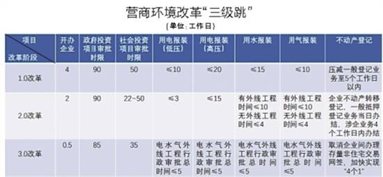 3.0改革中,从五方面提出26条改革任务、82项改革举措,可概括为“123”:坚持1个导向(以市场主体的获得感和满意度为导向),着力提升政务服务市场主体满意度;结合2种评价(世行评价和国家评价),聚焦企业全生命周期深化改革,推进“四减一优”(减流程、减成本、减材料、减时间、优服务);打造3个高地(创新创业创造高地、国际营商规则衔接高地、法治化营商环境高地)。