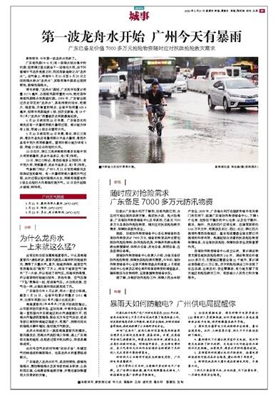 新快报讯 今年第一波龙舟水到来了。广东前汛期(4-6月)有一段降水较为集中的时期,经常隔三差五就会下一场滂沱大雨。由于时值端午节龙舟竞渡之时,民间形象地称之为“龙舟水”。在气象上,将每年5月21日至6月20日之间的降水称为“龙舟水”,其降雨集中期易出现持续性、极端性强降水。