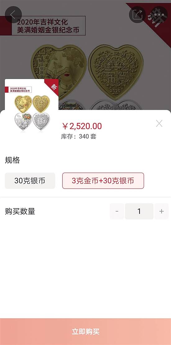 该工作人员同时提醒,“金银币面额仅仅是法定货币象征,并不等同于贵金属纪念币自身的价值,也不是其发售时的价格,所以心形金币不可能用50元买到,心形银币同样不能用10元买到。”目前工行融e购平台上显示,一套心形纪念币共两枚(30克银币+3克金币),价格为2520元,库存340套;30克银币价格为520元,库存也为340套。购买页面上同时提醒:“本商品为预售,购买后20个工作日内发货”。