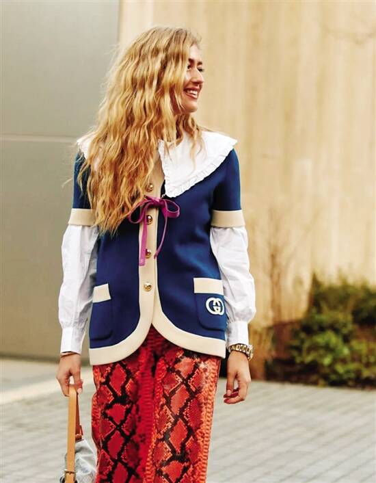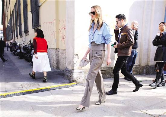 ▲大领子外翻的穿法是今年早春秀场内外的新宠,在针织衫、西装乃至大衣下,跃出大领子,即可点亮造型的生动感。