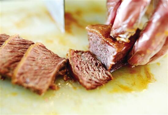 汤汁渐浓,牛肉可以出锅了,厚切成片,碟子上垫上清香的荷叶,这就是菜名当中“荷香”二字的由来,温热的牛肉激发出荷叶的清香,肉香、药材香与荷叶香的共融,令人不由得食指大动。