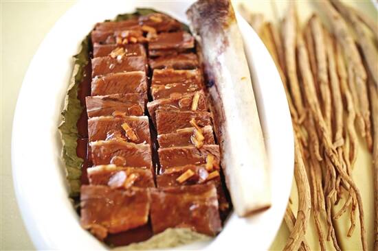 “这道菜几乎每桌必点。”叶友青总厨一边说着,一边给事先准备好的进口牛小排依次加入党参、黄芪、香叶、豆蔻、草果等不同辅料,准备开火焖煮。