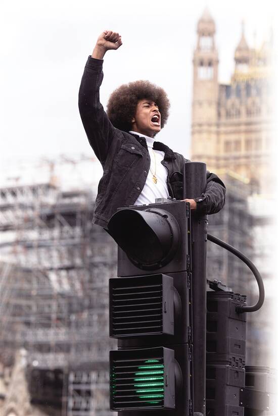■6月3日,一名示威者在英国伦敦参加抗议活动。新华社发