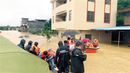 ■从昨天6时至18时,广州增城正果何屋12小时累计降雨量达到289.4毫米。面对来势汹汹的“龙舟水”,正果镇城管执法队队员动用冲锋舟等工具转移受灾群众。通讯员供图
