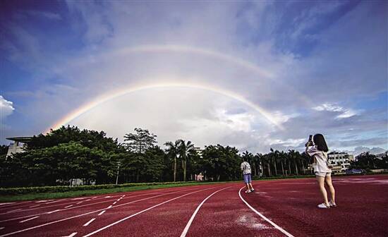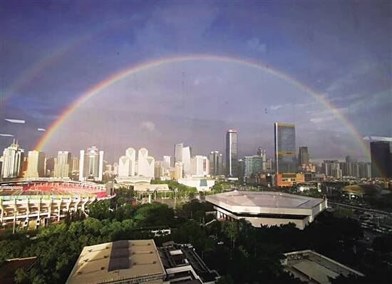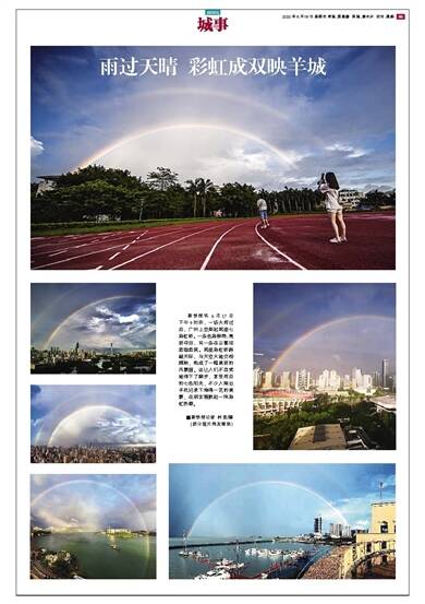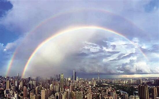 新快报讯 6月17日下午6时许,一场大雨过后,广州上空架起两座七彩虹桥。一条色彩鲜艳、亮丽夺目,另一条在云雾间若隐若现。两座彩虹桥跨越天际,与天空大地交相辉映,构成了一幅美丽的风景画。这让人们不自觉地停下了脚步,享受雨后的七色阳光,不少人掏出手机记录下难得一见的美景,在朋友圈掀起一阵彩虹热潮。