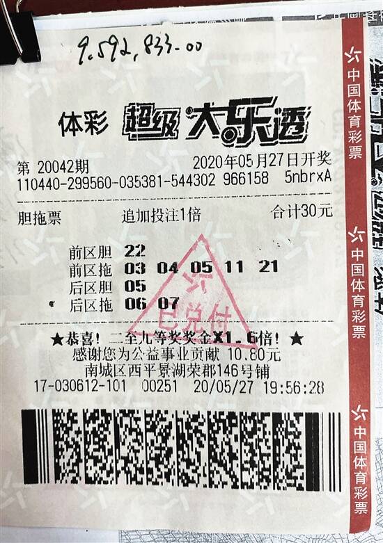 当期东莞4417030612体彩实体店共中出2注追加一等奖、1注基本一等奖。2注追加一等奖的两张中奖彩票分别是一张30元的追加胆拖票、一张42元的追加胆拖票,单票总奖金分别达到958万多元、959万多元。1注基本一等奖的中奖彩票是一张24元胆拖票,单票总奖金507万多元。