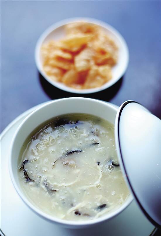 同样选用走地鸡的新鲜鸡肉,入锅以高温煎炒至肉变成金黄色且出香,倒入之前的老鸡高汤净汤,再以高温熬制两小时至汤汁呈奶白色,最后加入花胶丝、木耳丝、春笋丝、陈皮丝煮开,加上几片薄脆,入口汤浓味鲜,直叫人叹为观止。