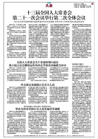 发言人说,美国近月公然偏离国际法及国际关系基本准则,无视过去一年在香港特区发生的猖獗暴行,以人权、民主和自治等为借口,针对香港通过法案及宣布行政指令;近日更肆意诋毁由全国人民代表大会常务委员会通过并在香港公布实施的香港国安法,充分暴露其双重标准及虚伪,并严重损害双边关系。中央政府及特区政府已多番对美方行径表示坚决反对,中央政府亦强调保留采取反制措施的权利。