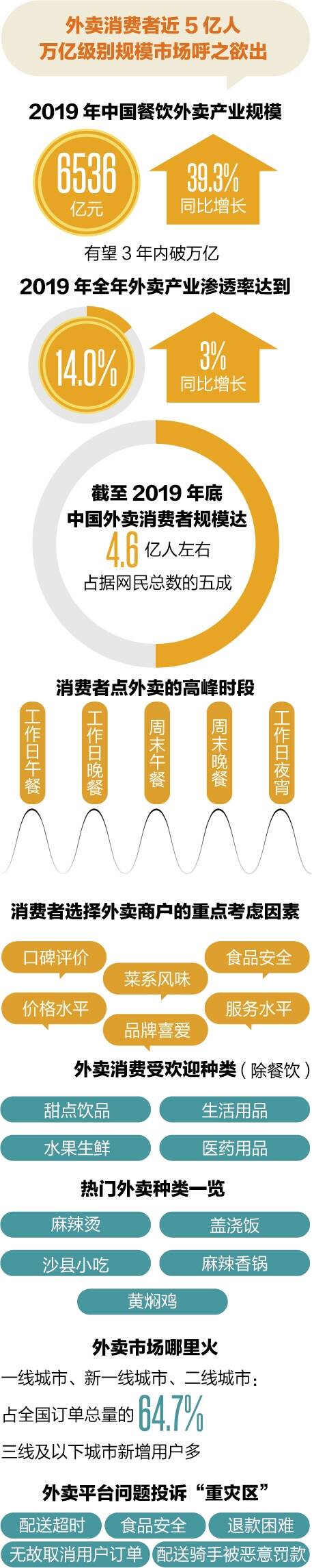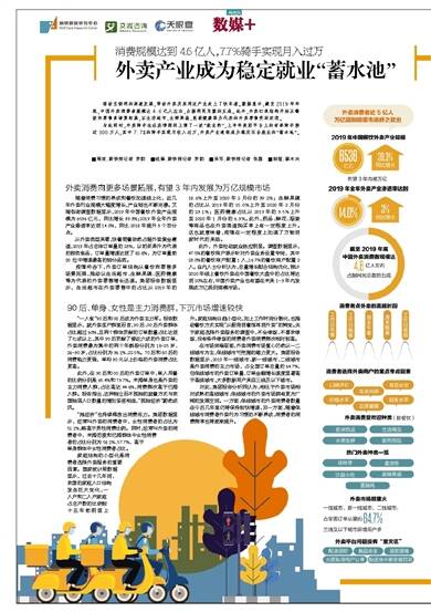 移动互联网的高速发展,带动外卖及其周边产业走上了快车道。数据显示,截至2019年年底,中国外卖消费者规模达4.6亿人左右,占据网民总数的五成。此外,外卖订单结构开始从餐饮向零售多场景拓展,以生活超市、生鲜果蔬、医药健康等为代表的外卖零售受到欢迎。与此同时,外卖骑手也在疫情期间上演了一波“就业热”,上半年美团平台上的有单骑手接近300万人,其中7.7%的骑手实现月收入过万,外卖产业逐渐成为稳定社会就业的“蓄水池”。