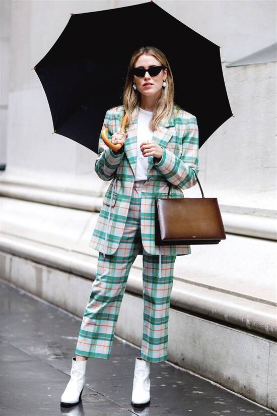 ▲ 白色与墨绿色的格子纹款式西装,多了一份通勤的正式感。九分裤的设计加上低筒靴的高跟鞋,为西装造型增添不少女人味。