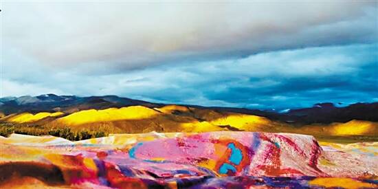 9 月 18日-19 日,“等风来——王义明的艺术行动”之《虹》(Rainbow)于西藏日喀则岗嘎镇,面对珠穆朗玛等几座八千多米的山峰,徐徐展开。艺术家王义明历时多年创作的 83 件巨幅画作,由 57 头牦牛驮负着,沿着山坡曲线,在阳光、蓝天、白云、雪山、旷野和风共同创构的场域中,搭设成一道寄予着人们美好祈愿的彩虹,在地球第三极呈现。
