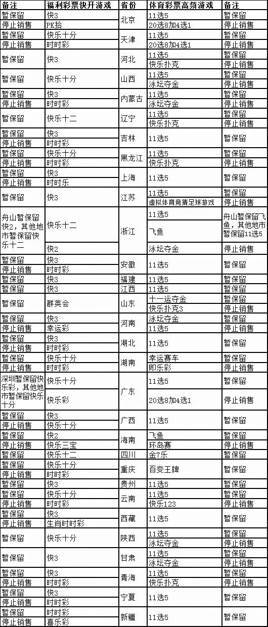 一是有序退市高频快开游戏。自2020年11月1日起,各省、自治区、直辖市福利彩票快开游戏、体育彩票高频游戏(含虚拟体育竞猜足球游戏)分别暂保留一款,其余的一律停止销售。暂保留及停止销售的具体游戏及所属省份详见附件。2021年春节休市结束后,所有高频快开游戏全部停止销售。