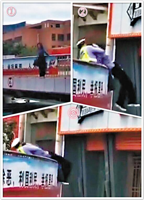 新快报记者从目击者拍摄的视频看到,一名年轻女子正站在大北天桥上外侧,身体外倾,双脚站在不足10厘米宽的天桥边缘,只靠双手抓住栏杆维持平衡。大北天桥地处市桥交通最繁忙路段,由于正值下班高峰期,车流量非常大,该女子如果跳下去,不但自己有危险,也极大可能会造成二次伤害。