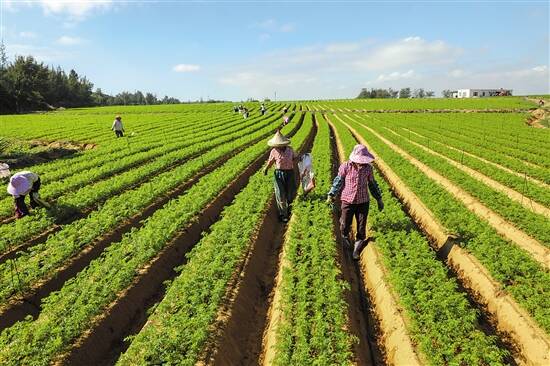 ■揭阳市惠来县靖海镇后湖村的红萝卜基地上绿油油一片,密密麻麻种满了红萝卜,十几名来自后湖村和周围乡村的村民正在除草。