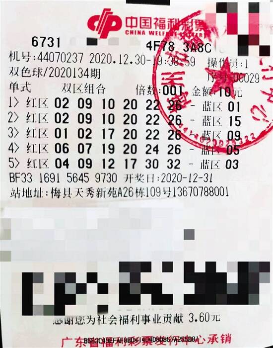 2020年12月31日,福彩双色球20134期开奖,摇出开奖号码为:红球“02、09、10、20、22、26”;蓝球“01”。当期全国中出48注一等奖,单注奖金5382786元,广东中出2注一等奖,其中,1注花落梅州市。据广东省福彩中心检索,梅州市中出头奖站点为梅县区天秀新苑A26栋109号44070237福彩投注站,中奖彩票为一张10元5注单式票,除中得1注一等奖外,还中出1注83517元的二等奖,单票总奖金达到546万多元。