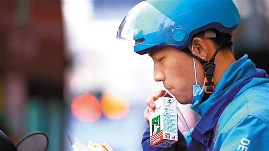 左手一块三明治,右手一盒纯牛奶,坐在外卖电动车上李威正在抽空吃着午餐。“跑单高峰期的时候,这是常态。”李威说,很多时候都是在等客户来拿餐的间隙补充点能量。