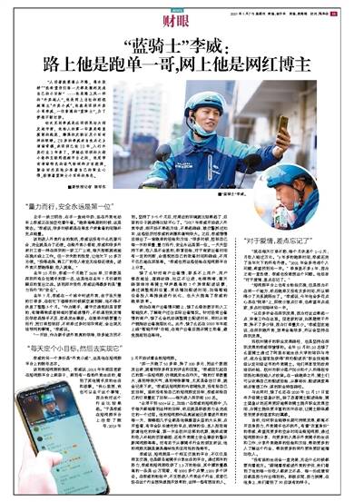 “人活着就要逢山开路,遇水架桥”“我希望你们每一天都是顺利完成自己的小目标”……他是路上风一样的“外卖超人”,他是网上当红的短视频博主“外卖小威”,他就是深圳外卖小哥李威,一位普通的“蓝骑士”,为了梦想不断打拼。
