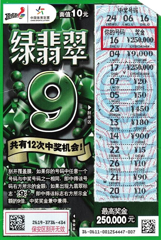 上市多年的“绿翡翠”是顶呱刮的长青票种,该票种每张面值10元,拥有12次中奖机会,最高奖25万元。在玩法上,该票种采用的则是经典的号码匹配游戏形式:刮开覆盖膜后,如果你的任何号码与中奖号码之一相同,就可以赢得该号码右边所示的奖金;如果得到一个九翡翠标志,就可以赢得该号码右边所示的九倍奖金。