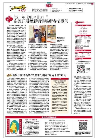 新快报讯 记者陆妍思 通讯员赖群生报道 “这一年,你们辛苦了!”2021年新春佳节来临之际,1月18日起,东莞福彩中心工作人员组成八个小组对全市福彩销售场所进行走访慰问,向他们致以亲切的节日问候,感谢东莞市福彩一线销售人员一年来的辛勤付出,激励全体福彩销售人员以更加饱满的热情投入工作。结合慰问活动,东莞福彩中心对福彩销售场所进行消防安全、疫情防控专项检查,同时检查了全市高频快开游戏销售场所的整改落实情况。