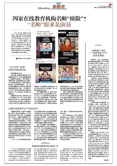 近日,作业帮、猿辅导、高途课堂、清北网校等四家在线教育头部机构聘请同一位“资深老师”为其“背书”的新闻引发热议。后来发现,这一系列的“撞脸”,只因这几家在线教育机构找了同一家供应商。尽管这些广告在事情发酵不久后便相继下架,但已经暴露出在资本逐步主导和影响下,当前在线教育产业存在的虚假广告和监管缺失等行业乱象。