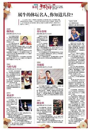 十二生肖中,牛给人一种憨厚、忠诚的感觉;在中国传统文化里,牛也因勤劳、奉献、奋进的特性深受人们喜爱——牛的这种“内涵”在体育中也是不可或缺的一种品质。那么,在牛年到来之际,我们就来数一数体坛大家庭中这些属牛的明星们,看看他们身上有些什么“牛脾气”。